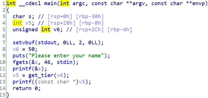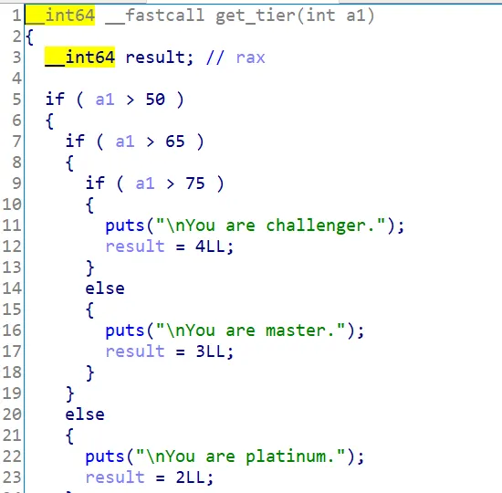 get_tier라는 함수의 반환값을 v5에 저장하고 v5에 담긴 내용을 출력한다. 이부분에서 에러가 발생한다. get_tier는 50이라는 고정 값을 인자로 가지고 들어간다