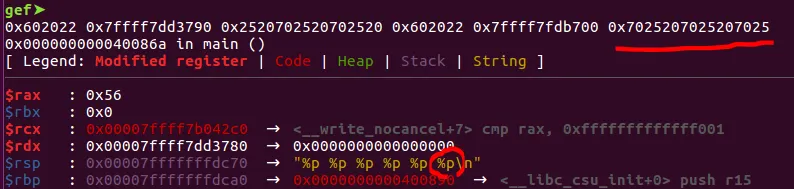 %p를 총 6개 인자로 하여 printf를 호출하면 6개의 주소가 leak되는데 가장 오른쪽 즉, 6번째로 출력되는 것이 바로