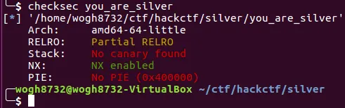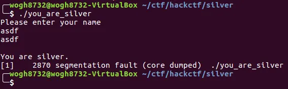 바이너리를 실행시키면 이름을 입력하라고 한다. 그리고 입력한 문자열을 그대로 출력해주고 "you are silver" 라는 문구와 함께 종료가된다. 그런데 정상적인 종료가 아닌 segmentation fault가 뜬다. 이 부분을 유심히 볼 필요가 있어보인다