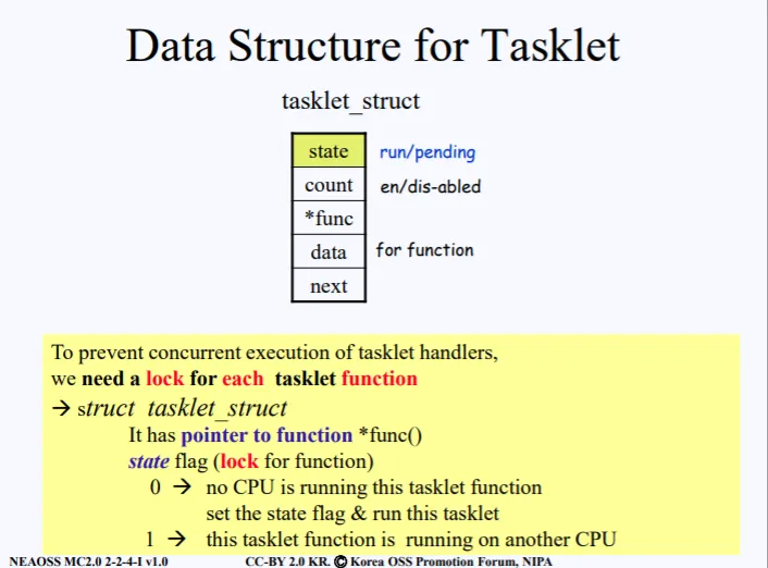 Tasklet의 구조체를 보면 state라는 필드가 있다. 이 필드를 보고 현재 1이면 접근을 못하고 0이면 아무도 사용안하고 있기때문에 사용가능하다.
