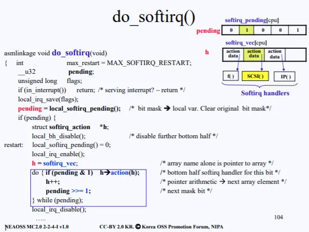 현재 pending 배열이 아까 말한 softirq_pending[]인데, 여기서 하위 한바이트를 확인하고, 1이면 이에 해당하는 softirq_vecc 즉, h→action을 호출한다. 그다음 pending을 쉬프트 연산을 통해 하나씩 반복해서 확인한다. 실제 h→action이 Softirq handler의 역할을 진행한다.