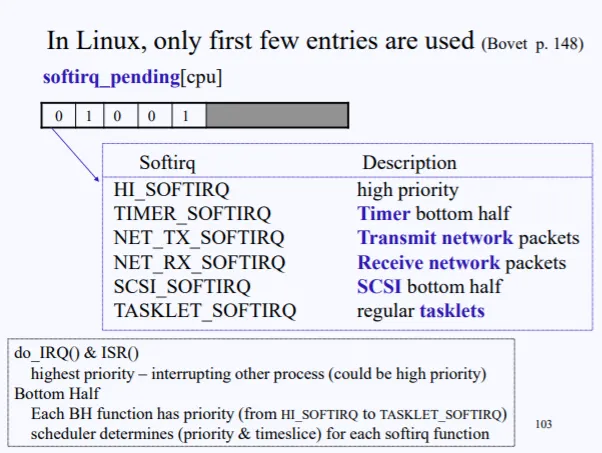 인터럽트 요청이 오면 Top Half 루틴이 수행되고, 큰 작업이 수행되야할때는 Top-Half에서 soft irq bit을 세팅한다고 했다. 왼쪽 아래에 보이는 게 바로 그 bit이다.
