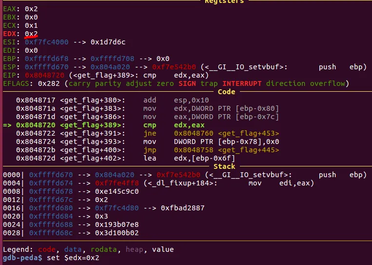 scanf로 2를 입력함. 현재 edx들어있는 값을 0x2로 변경할꺼임