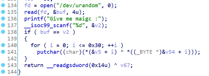 main문에는 별게 없고 get_flag함수가 중요하다. 해당 함수를 살펴보면 /dev/urandom 을 열고 4바이트 만큼 buf에 저장한다. 그다음 입력을 v2에 받고, buf와 v2를 비교하여 두 값이 일치하면 for문으로 뭐를 출력해준다. 아마도 flag 인것 같다
