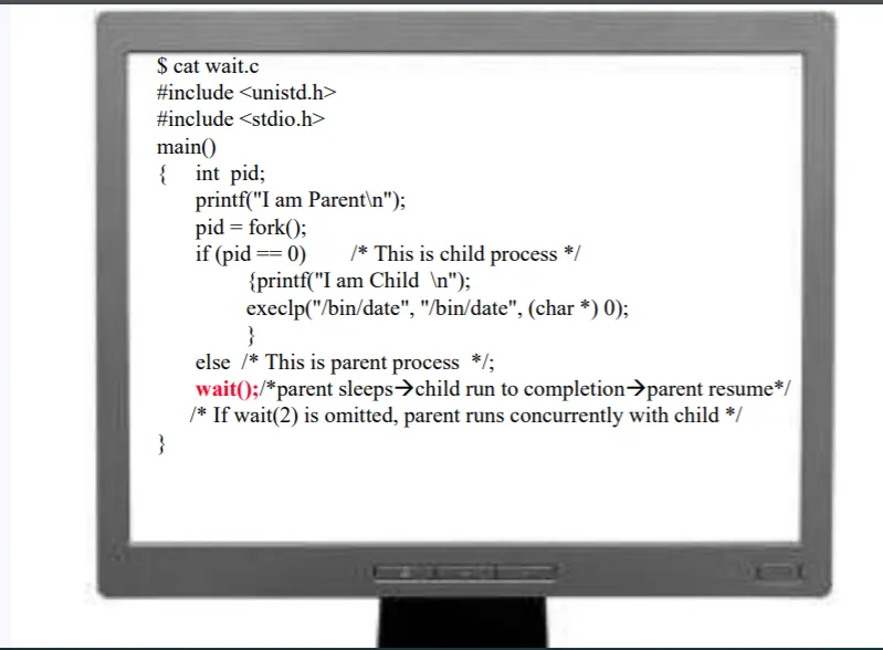fork의 호출이 끝나면 부모 프로세스 쉘은 다음 로직을 수행하게 되는데 바로 wait()를 호출하게 된다.