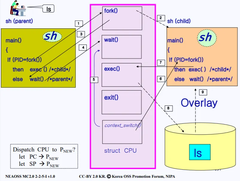 여태 말한 내용을 총정리해보자. 아래 사진은 우리가 리눅스 터미널을 띄우고 쉘에서 ls 명령어를 칠때의 내부 동작과정을 나타낸다.