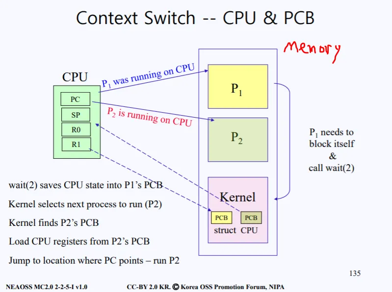 이런 상황에서 현재 CPU가 P1 프로세스를 실행시키는 도중 P1을 block 시켜야할 때가 되어서 wait syscall을 호출한다. 그러면 커널모드로 변경되게 되고, 커널 안에 존재하는 sys_wait을 호출하면서 현재 P1 프로세스의 CPU state vector (PC, SP, 각종 레지스터들 등 )를 P1의 PCB에 저장하게 된다.