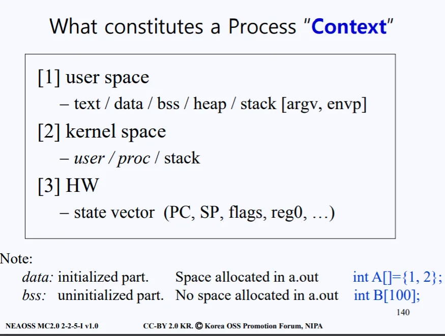 user space에서의 context는 text, data, bss, heap, stack 영역을 뜻한다.