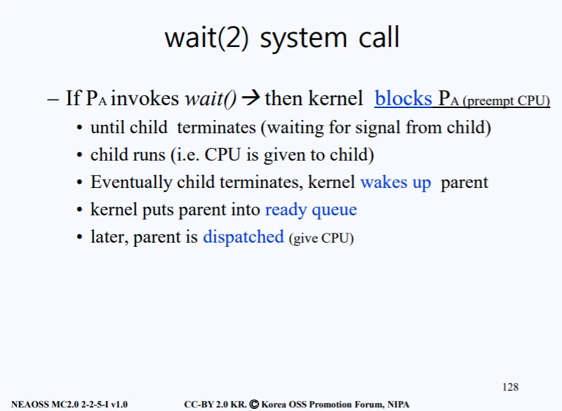 하지만 wait() 시스템 콜은 다시 A 프로세스의 유저모드로 돌아가지 않는다. wait() 자체가 대기하라는 기능이므로 커널은 A 라는 프로세스로 돌아가지 않고 CPU를 다른 놈에게 줘버린다. 즉 A는 대기 상태가 되고, 예를 들어 B 프로세스에게 CPU를 넘겨주게 된다.