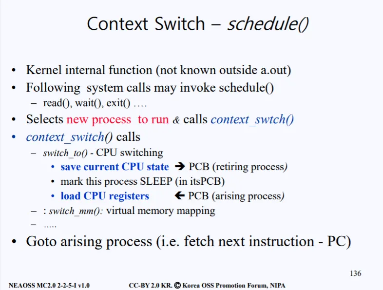 만약 선택된 프로세스가 P2라면, P2의 PCB로부터 cpu state vector 들을 cpu에 로드시킨다. 그 후에 이제 PC에 저장된 주소로 이동하면서 P2 프로세스가 실행된다. 이 과정이 바로 Context Switching이라고 부른다. 해당 Context Switching을 해주는 놈이 커널안에 schedule() 이라는 함수이다.