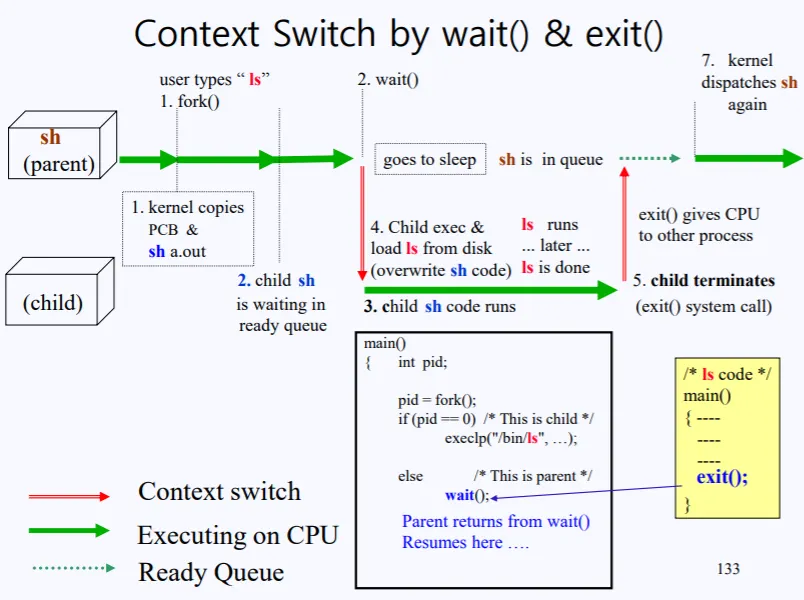커널에서 sys_wait를 호출하면서 현재 부모 프로세스의 리소스 정보 즉, 현재 cpu state machine(레지스터들)을 부모 PCB에 저장을 하게되고 context_switch() 함수를 호출하여 레디큐에 들어있는 프로세스에게 CPU를 양도하게 된다. 그리고 부모 프로세스는 block되어 sleep 상태로 된다.