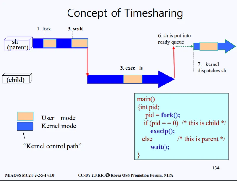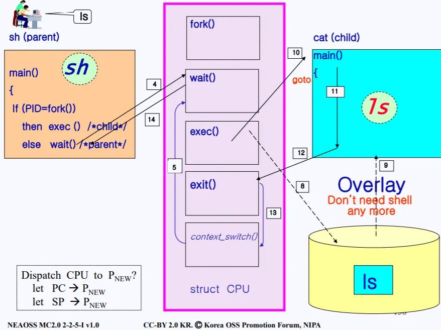 부모가 wait을 호출하게 되면, 그때야 비로소 자식 프로세스 쉘 코드가 실행이 된다. 자식은 execlp함수를 호출하여 '/bin/ls'를 실행시킨다. 즉 디스크로 부터 'ls' 관련 이미지(코드)를 가져와서 현재 쉘 프로세스에 덮어쓴다. 따라서 우측에 나와있는 ls 커맨드 code가 쉘에 올라온다.