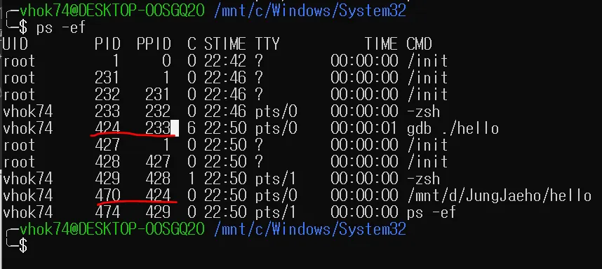 hello를 gdb로 현재 로드한 상황이다. main 에 bp를 걸고 생성된 프로세스들을 확인해보았다. gdb를 수행한 프로세스는 현재 내 쉘(pid:233)에서 fork가 되서 pid 424를 가지게 된다. 여기서 main까지 실행을 시키면 fork가 또 일어나 자식프로세스가 생성되면서 pid 470인 프로세스에서 hello가 실행되는걸 볼수가 있다.