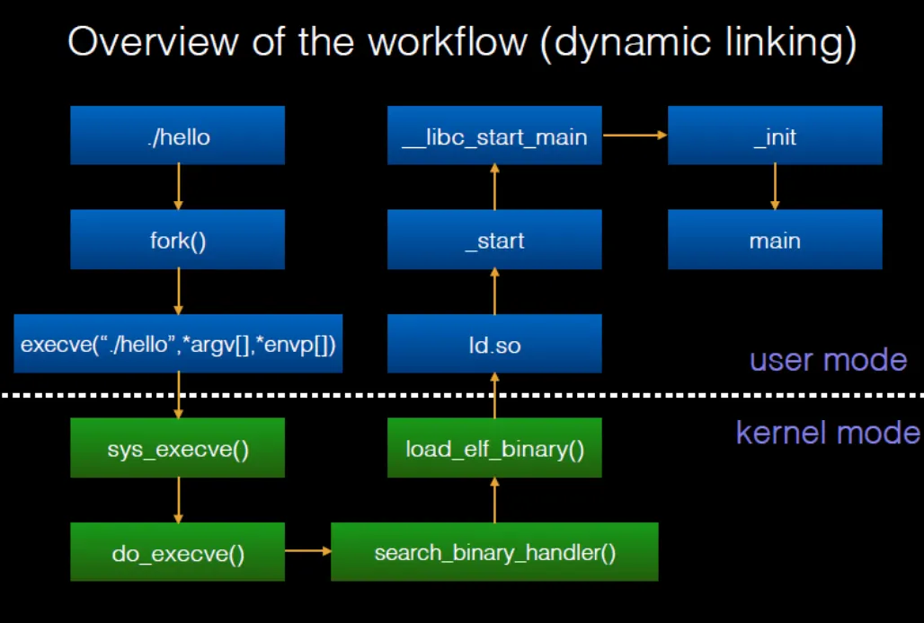 ./hello를 터미널에서 입력하면, fork() 함수가 호출되면서 자식 프로세스를 생성한다. 그다음 그 자식프로세스에서 execve함수를 호출하여 실제 hello 바이너리를 실행시키면, 이때부터 커널 모드로 넘어가서 전전강의에서 설명한 커널로직이 수행된다.