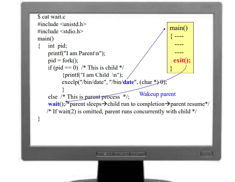 exec 함수로 date 프로그램을 실행하면, 디스크에서 date 프로그램의 이미지(소스코드로 이해하자) 를 디스크에서 가져와서 실행하고, main문 부터 실행이 된다. 쭉쭉 실행되고, exit() 시스템 콜을 호출하면서 자식프로세스는 종료되고, 그 때 부모가 exit()으로 인한 시그널을 받아 일어나게 되는 것이다.