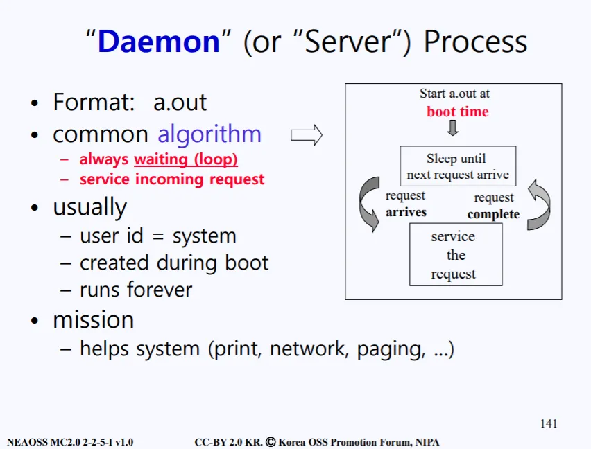 추가적으로 데몬 프로세스에 대해서 설명하겠다. 데몬이란 일반적으로 부팅시에 로딩되는 프로그램을 뜻하는데, 백그라운드에서 계속 상주해 있는다. 사용자로부터 요청이 오면 해당 요청을 처리해주고 다시 sleep모드로 들어가는 동작을 반복한다. 또한 데몬 프로세스의 ppid는 1이다. 데몬 프로세스는 다음과 같은 것들이 있다.