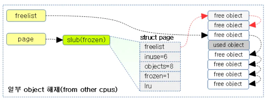 이때 전담 CPU가 아닌 다른 CPU가 2개의 오브젝트를 해제시켰다. 따라서 c→page→freelist에 두개의 오브젝트가 연결되고, inuse값이 2개 감소된다.