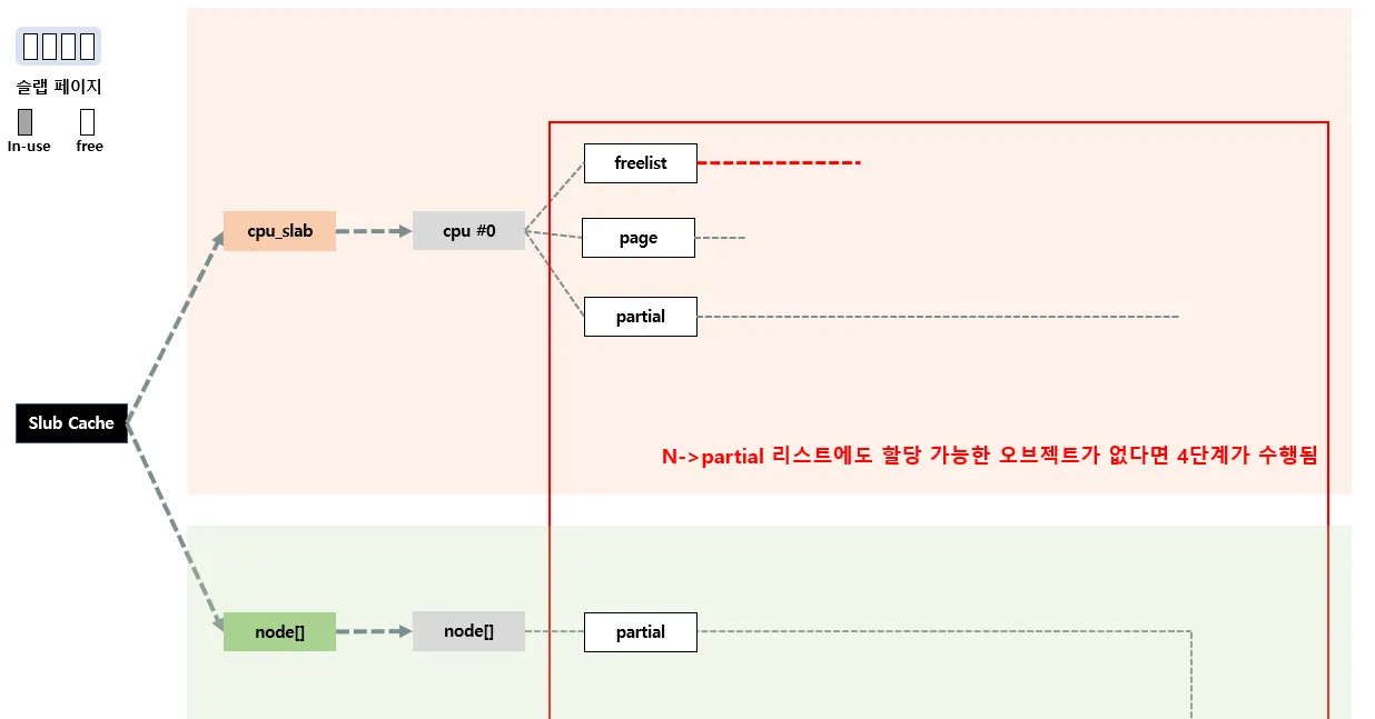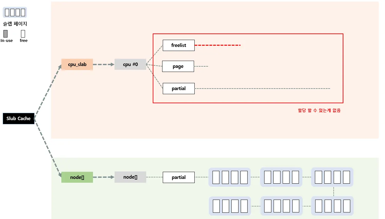 그리고 또 할당요청이 왔다. 현재 c→freelist에는 할당해줄수 있는 오브젝트가 없으며, c→page→freelist 또한 할당해줄수 있는 오브젝트가 없다. 따라서 c→partial 슬랩 페이지를 이용한다.