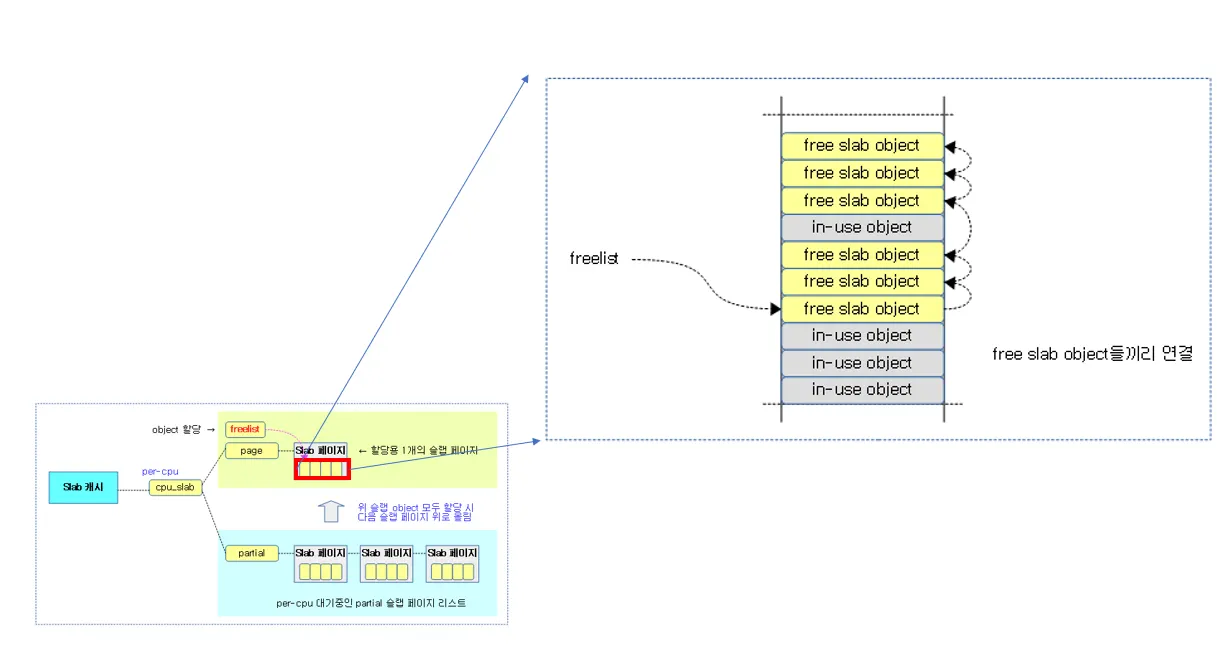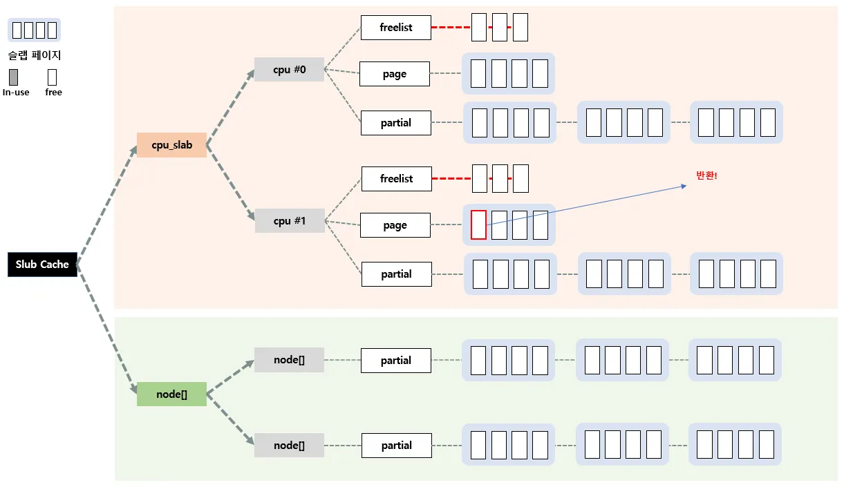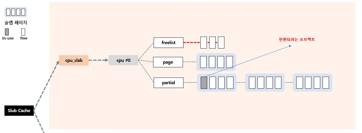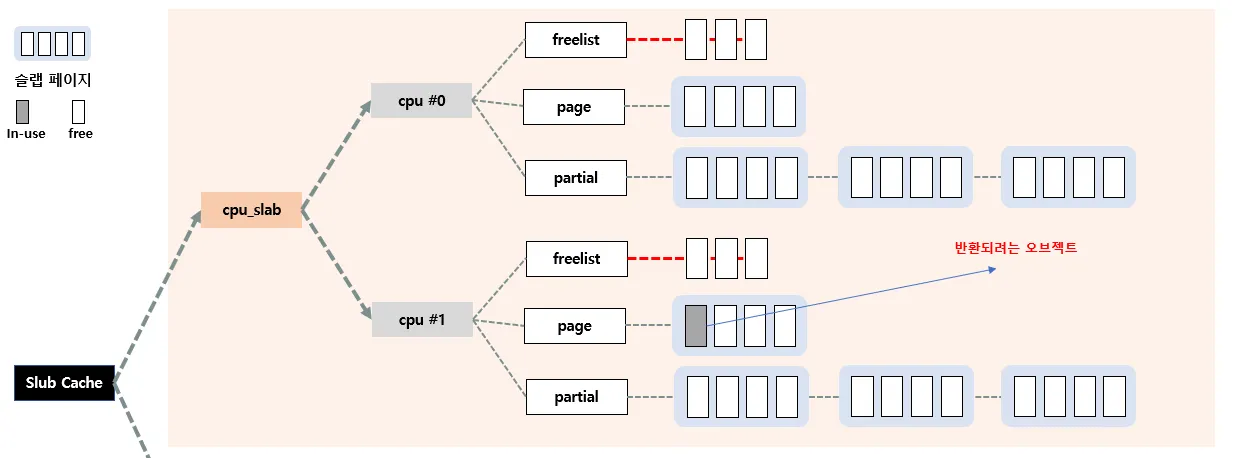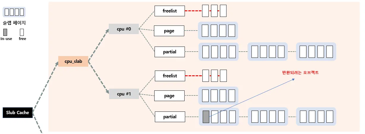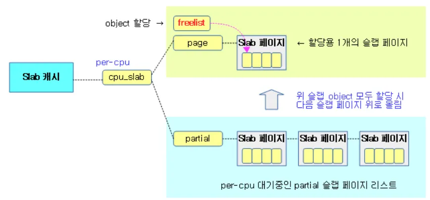 추가적으로 전담 CPU만이 슬랩 오브젝트의 할당, 해제가 가능하며 전담 CPU가 아닌, 다른 CPU는 슬랩 오브젝트의 해제만이 가능하다.