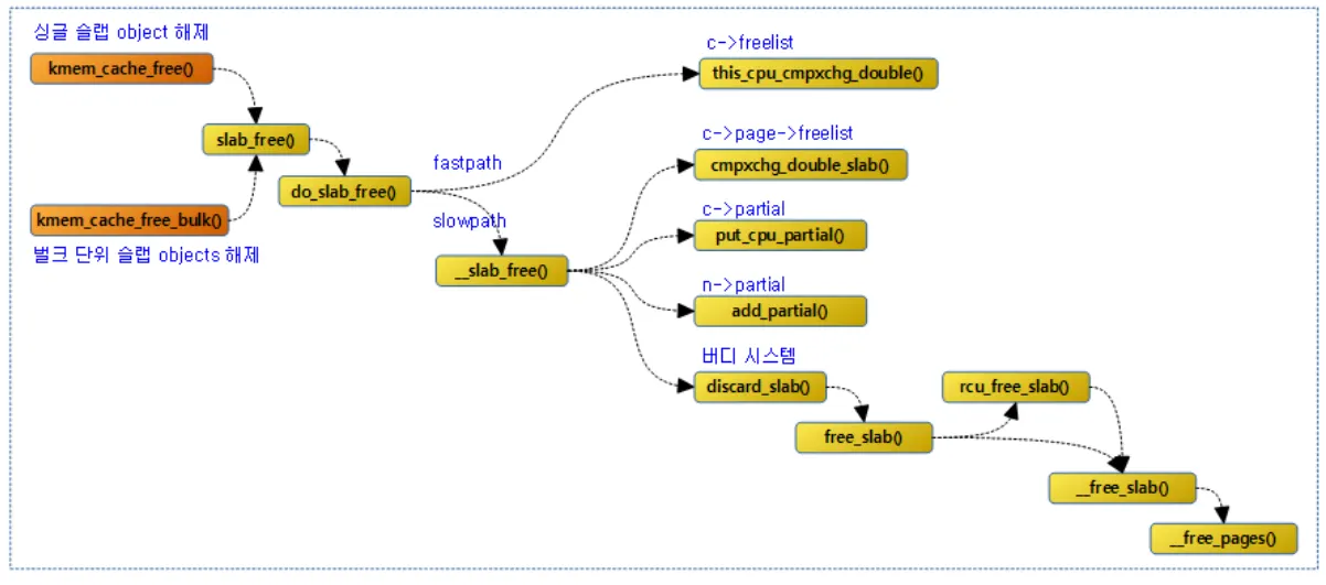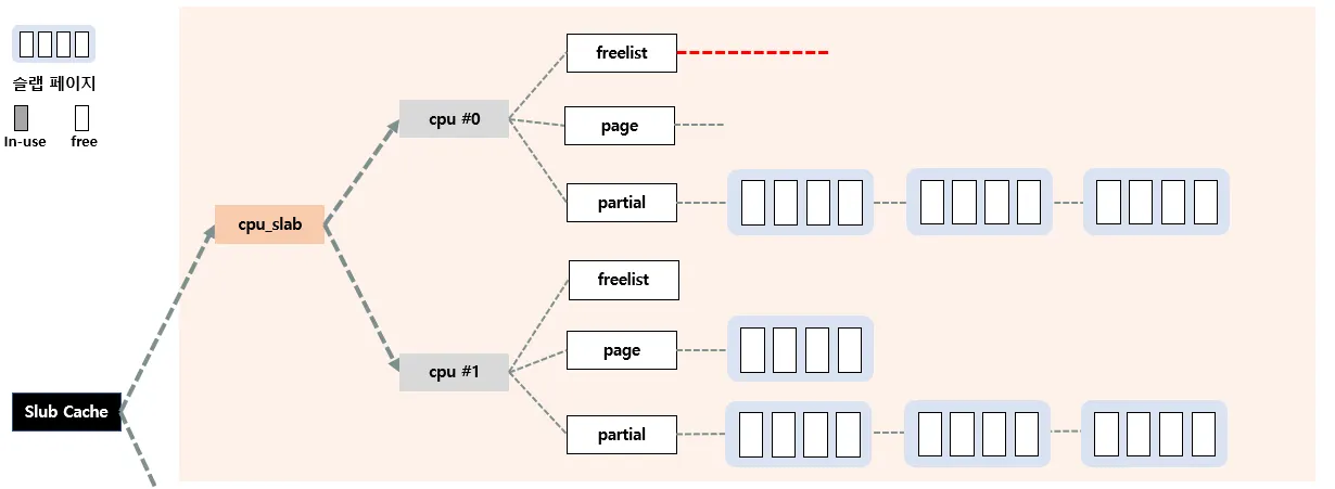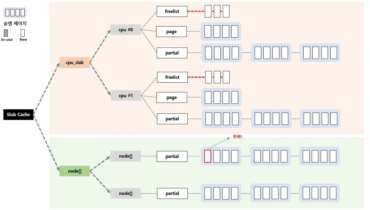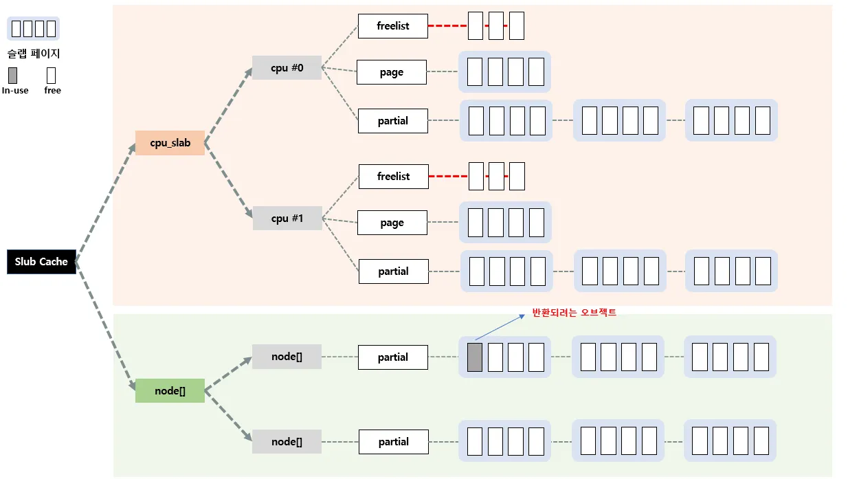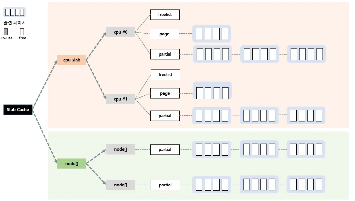 추가적으로 전담 CPU만이 슬랩 오브젝트의 할당, 해제가 가능하며 전담 CPU가 아닌, 다른 CPU는 슬랩 오브젝트의 해제만이 가능하다.
