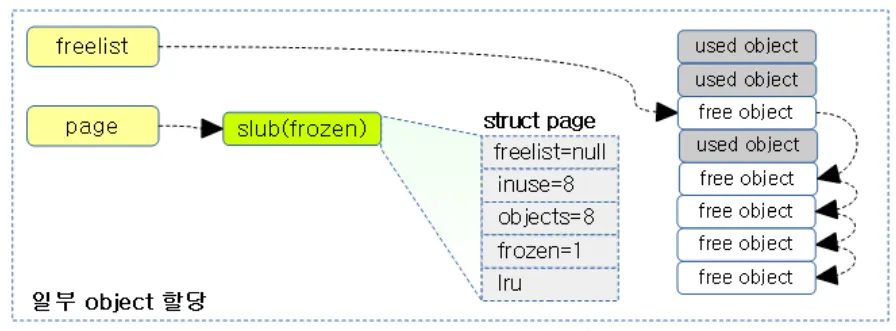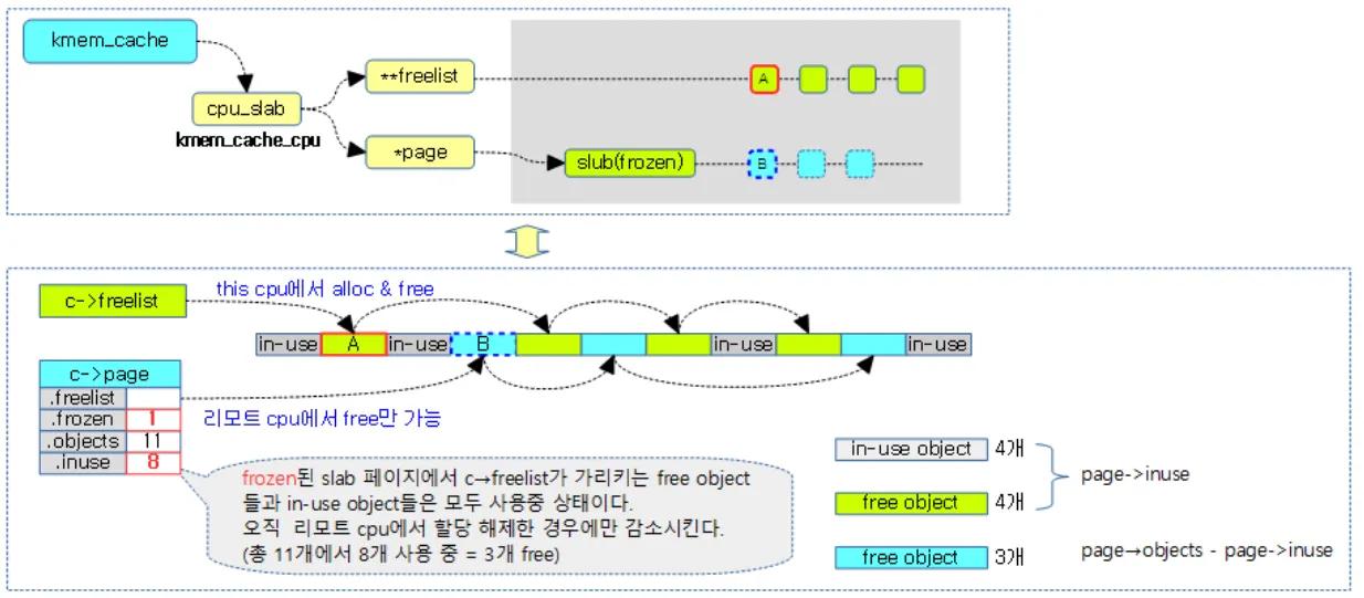 c->page에 연결된 슬랩 페이지이거나, c->partial에 연결된 슬랩 페이지들이 frozen 상태에 이며 node→partial 에 연결된 슬랩 페이지는 unfrozen 상태이다.