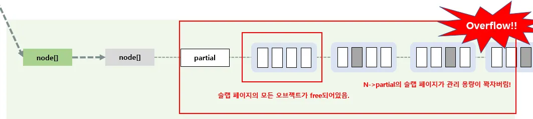 만약 아래 그림처럼 c→partial에서 관리할 수 있는 슬랩 페이지가 꽉차버렸고, 슬랩 페이지의 모든 오브젝트가 free되어있는 경우에는