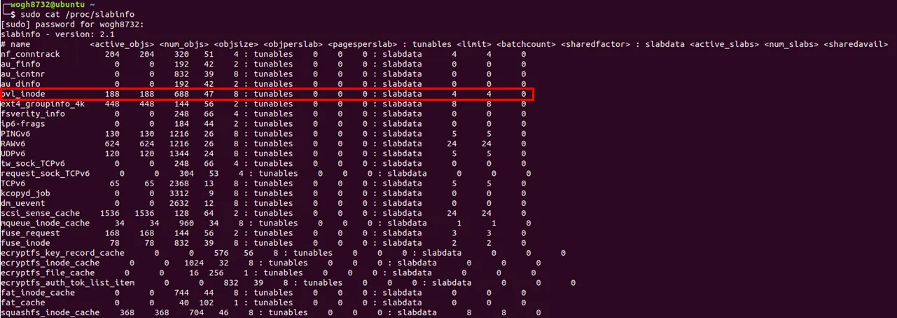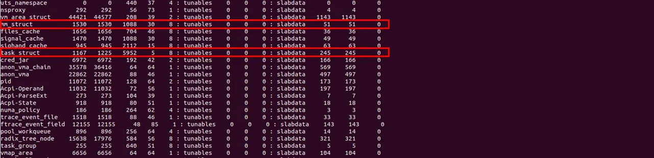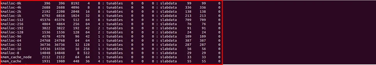 그럼 실제 커널에서 어떠한 슬랩 캐시가 존재하는지 cat /proc/slabinfo 명령어로 확인해보자