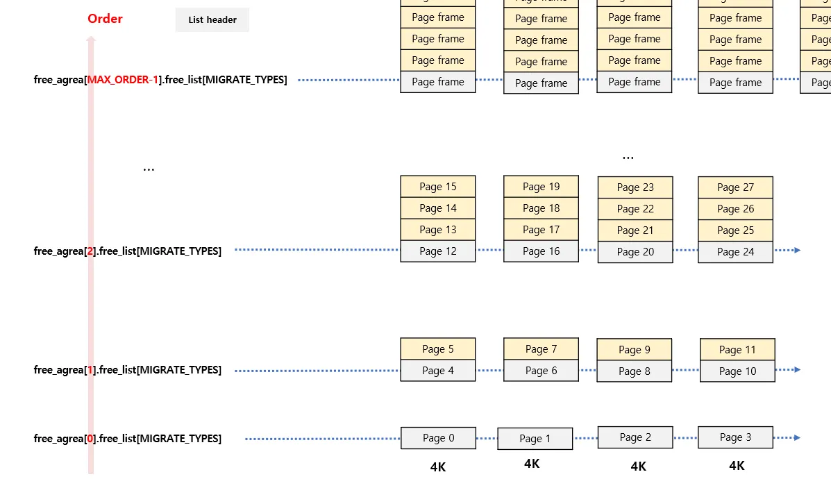 커널이 부팅되고 버디 시스템에 의해 Order-N 단위로 블럭들이 free_list에 연결되어 있다. page 단위는 4K 사이즈라고 가정했을 때 만약 여기서 3000byte 사이즈 메모리를 할당 요청이 들어게되면 어떻게 될까?
