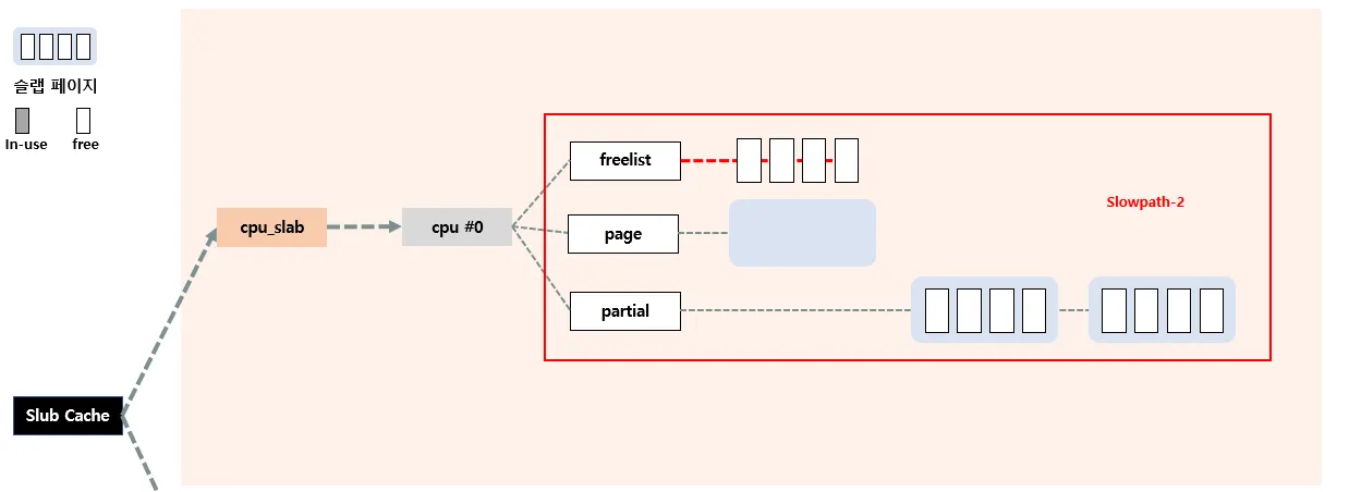 만약 Slowpath-1 단계에서 c→page에 free된 오브젝트가 없는 경우 Slowpath-2단계가 시행된다.