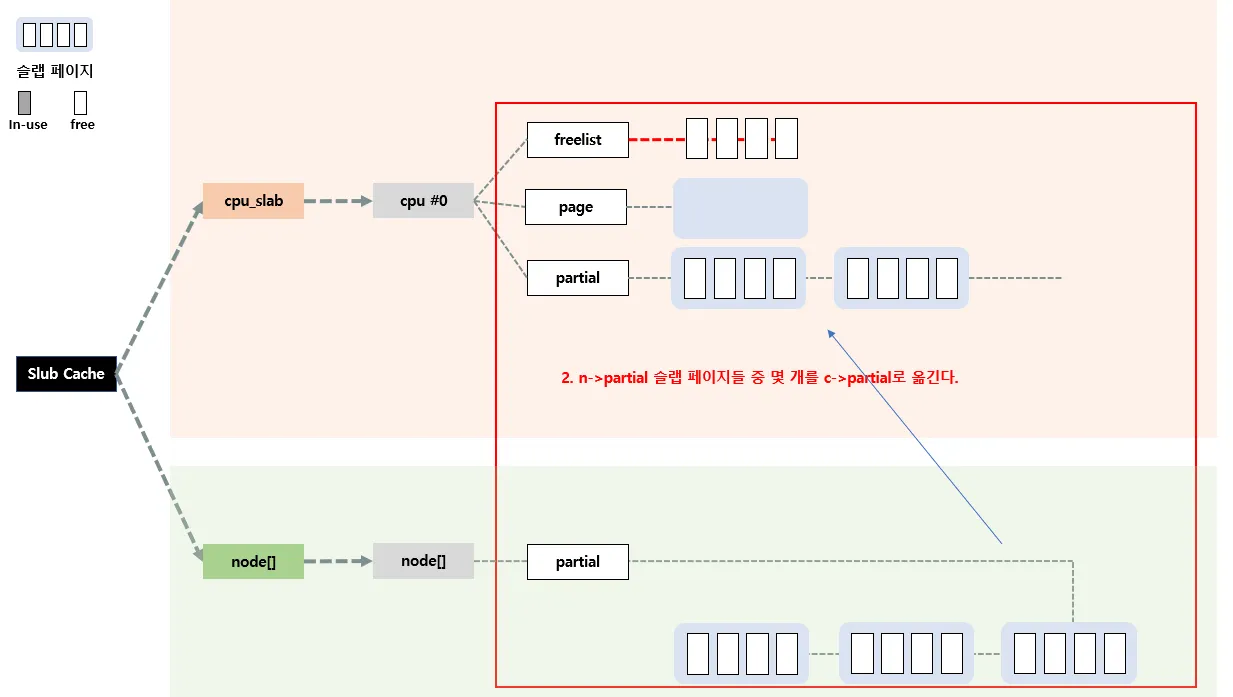 그리고 n→partial에 있는 슬랩 페이지들 중 일부를 c→partial로 이동시킨다. 만약 n→partial 리스트가 비어있는 경우에는 현재 per-node 슬랩 캐시말고 다른 노드의 n→partial을 뒤진다. 만약 여기도 없으면 마지막으로 Slowpath-4단계를 수행한다.