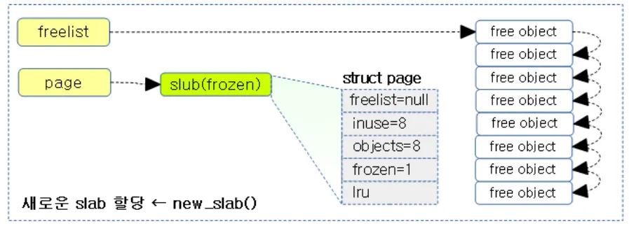 이제 Fastpath를 시행해서 할당해준다. 그리고 c→page에 있었던 슬랩 페이지의 오브젝트들이 전부 위로 올라갔으므로 해당 슬랩페이지는 unfrozen상태가 되며 이곳에 오브젝트가 하나라도 free되어 반환되기 전까지는 kmem_cache 슬랩 캐시의 관리를 벗어난다.