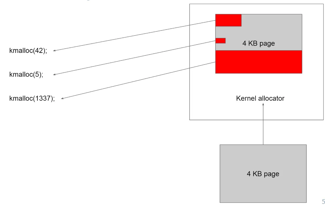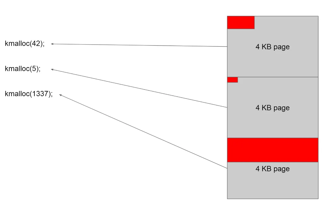 위 그림은 슬랩 할당자의 필요성을 간편하게 보여준다. 슬랩 할당자가 없다면 모든 메모리들은 페이지 단위로 관리되기 때문에 42byte의 메모리 요청시, 4K 페이지 하나를 할당해주고 그 안에서 42만큼 할당 해 줄 것이다. 5byte, 1337byte도 동일하다. 내부 단편화가 발생한다