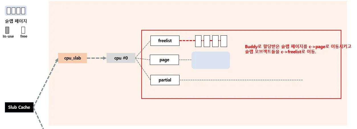 Buddy 할당자로 페이지를 할당받아 슬랩 페이지로 초기화한 후 c->page, c->freelist 에 슬랩 오브젝트를 옮긴다.