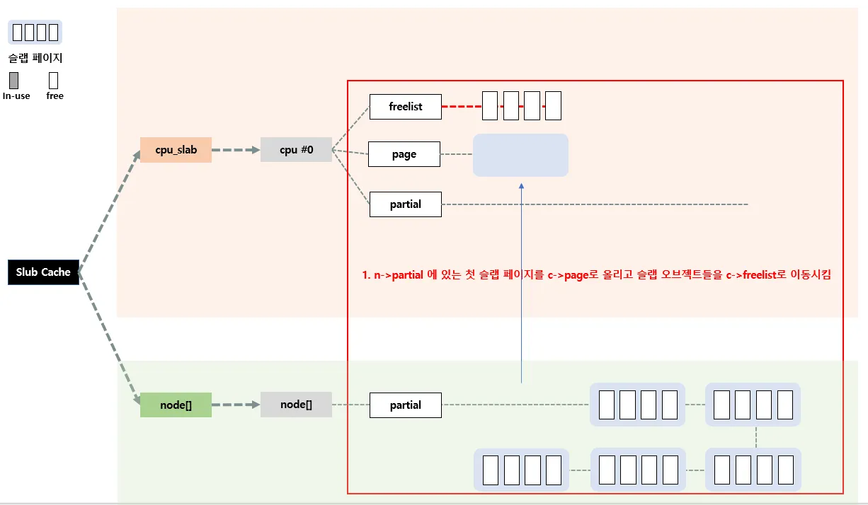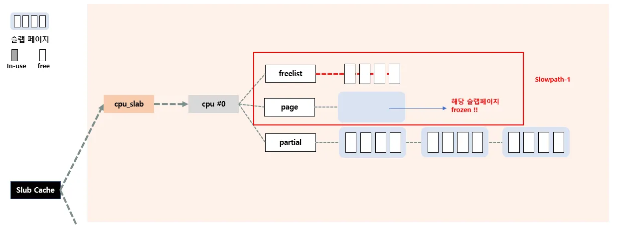 현재 c→freelist 에 사용할 수 있는 object가 없을 경우 Slowpath 방식이 실행된다. 그 중 첫번째로 slowpath-1이 시행되는데, 바로 c→page→freelist에 들어있는 오브젝트들을 c→freelist로 올린다음 다시 Fastpath를 시도한다.