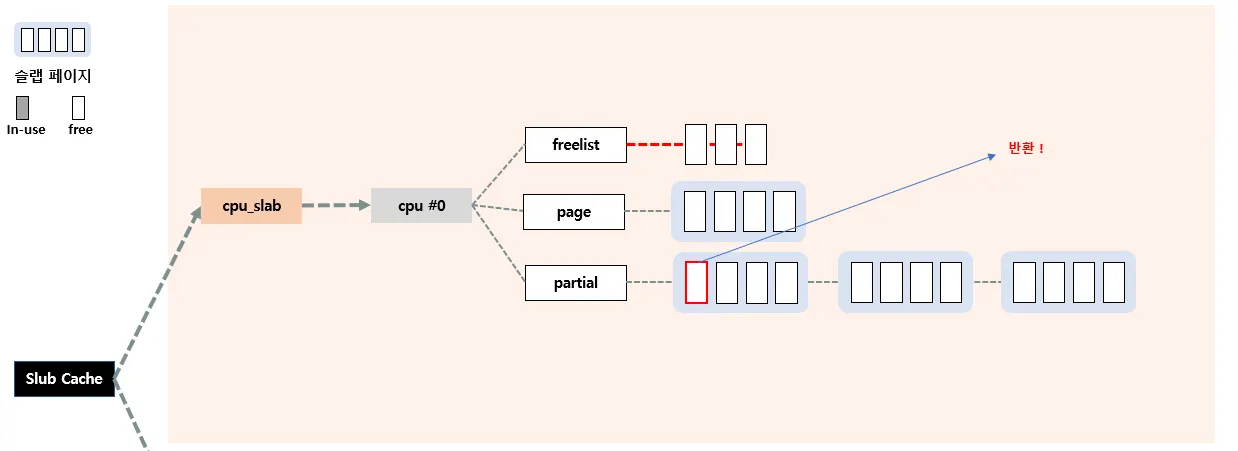 c→partial에 있는 슬랩페이지를 c→page로 올리고, 슬랩페이지 안의 오브젝트들은 c→freelist로 이동시킨다. 이로써 다시 Fastpath를 수행할 수 있게 된다.