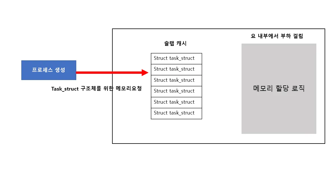 하지만 위에서 설명한 슬랩 캐시를 적용시키면 부하를 줄일수 있다. struct task_struct 구조체 크기만큼 동적으로 메모리를 미리 할당해두고 프로세스가 생성될 때 제공해주는 방식으로 말이다.