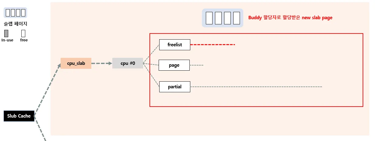 Fastpath, Slowpath1,2,3 다 실패하는 경우에 수행되는 단계로, 이는 아예 Buddy 할당자를 통해 새롭게 슬랩 페이지를 할당 받고, cpu_slab에 추가한다.