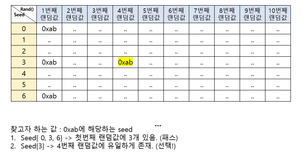 단 주의 할 점은, 검색할때, 각 시드에 대해서 동일한 시드 값과 비교해야한다. 무슨말이냐면 0xab 라는 랜덤값을 찾는다고 할때, 저 랜덤값이 어떤 시드에 대한, 몇번째 랜덤값인지는 모르지만, 세팅해 놓은 모든 경우의 수에서, 첫번째 랜덤값에 해당하는 모든 시드들을 비교하고, 검색안되면, 그다음 두번쨰 랜덤값에 대해서 다시 모든 시드들 비교, 이렇게 말이다.
