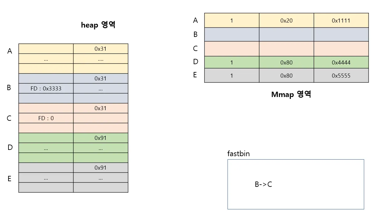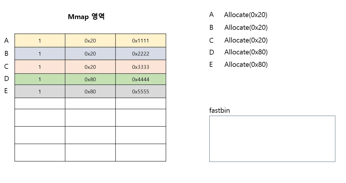 요렇게 5개 Allocate 호출했다고 해보자. 이상태에서 C, B 순으로 Free 시키면 두개는 fastbin에 들어갈 것이다.