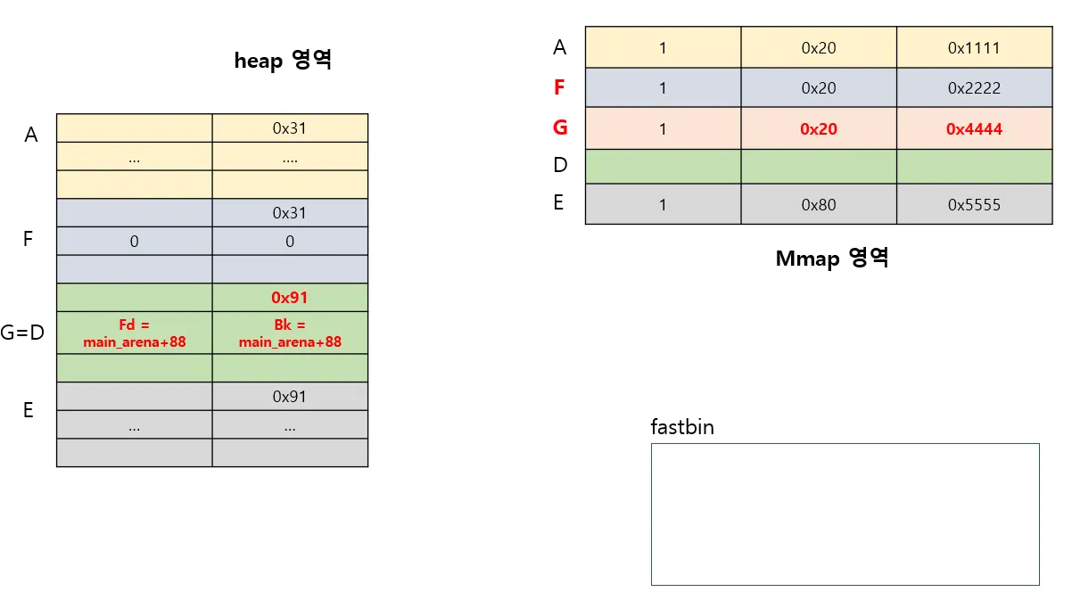 D청크를 free 시켰기 떄문에 fd에 main_arena+88값이 들어갔다. 하지만 G청크도 사실 동일한 주소를 가리키고 있기때문에, D를 Dump() 호출로 확인해보면, fd값을 leak할 수 있다.