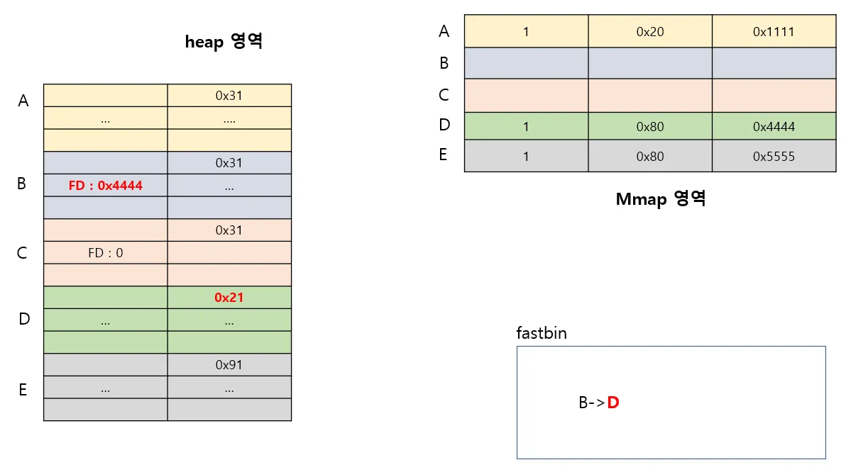 이 상태에서 인덱스 0번 즉 A청크의 데이터 입력을 통해 B청크의 FD를 덮을수 있다. FD값을 C청크가 아닌, D청크를 가리키게 하고, Allocate(0x20) 을 두번 호출하면, 처음에 B청크를 재할당해줄것이고, 그다음은 C청크가 아닌, 우리가 변경했던, D청크를 재할당 받을 것이다