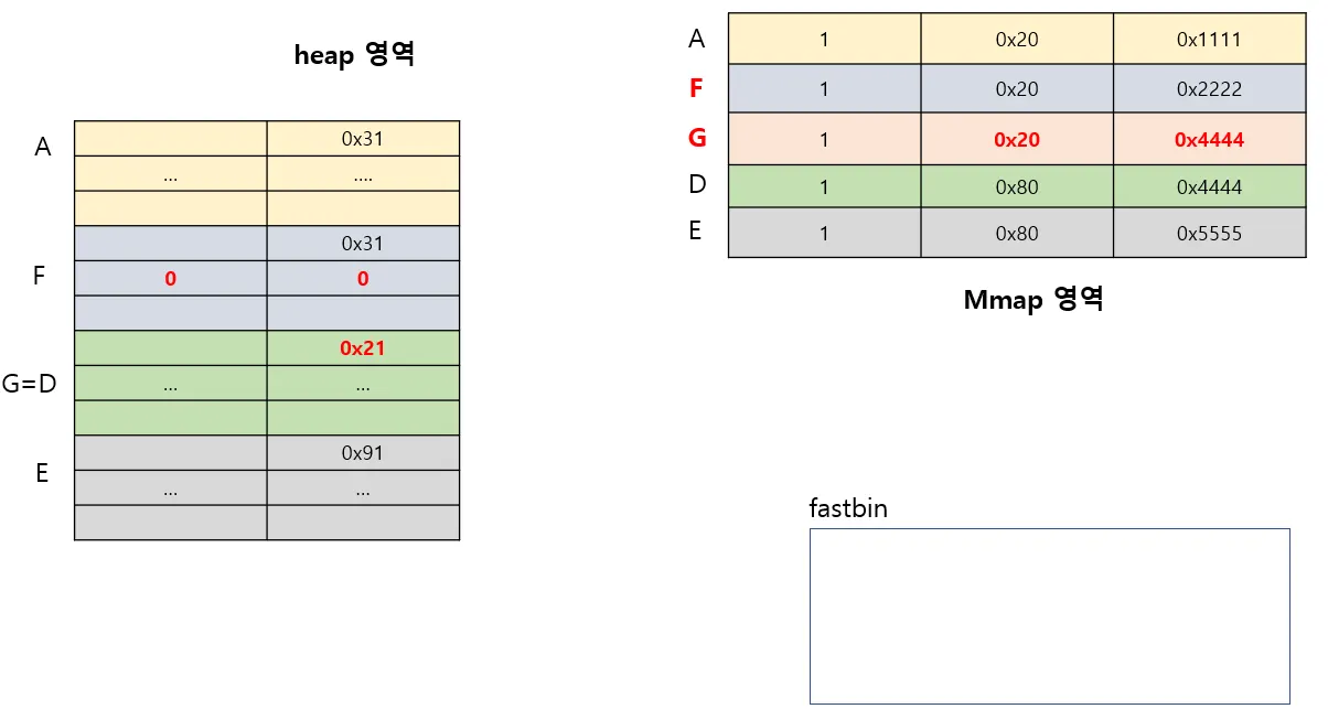 비여있는 인덱스 1,2 공간에 F, G 청크를 할당받았는데 F는 원래 B청크를 재할당 받은 것이고, G는 D 청크를 재할당 받은 것이다. 끝났다ㅋ mmap 영역에 현재 0x4444 주소가 두번 할당된 것처럼 되어있다. 인덱스 2,3이 동일한 주소, 다른 사이즈로 할당되어있다.