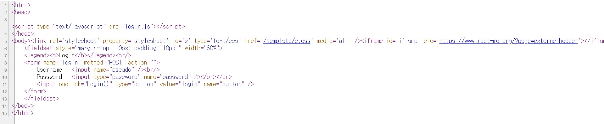 페이지 소스코드를 포면 from 태그안에 input태그가 있고, 해당 버튼의 클릭 이벤트가 발생할시, Login() 자바스크립트 함수가 실행되는걸 볼수 있다. 위에 script 태그로 login.js 파일을 포함하므로 해당 소스코드에 Login() 함수가 존재할 것이다.