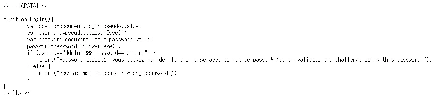 사용자가 입력한 Username과 password를 각각 변수에 담는다. document 객체의 login 이름의 form 태그의 pesudo 이름의 input 태그의 값을 pesudo에 담고, 소문자로 치환한다. 비밀번호 역시 같은 방식으로 치환한다. 아이디와 비밀번호가 위에 적혀진 값이면 정답이다.