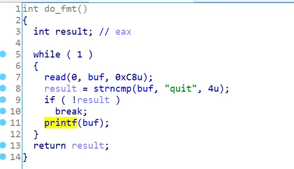 main → play → do_fmt 함수가 호출된다. 반복문으로 buf에다가 입력을 받고 'quit'을 입려하지 않은 이상 계속 printf(&buf)를 호출하고 다시 입력을 받는다. 여기서 서식문자가 없으므로 fsb가 터진다