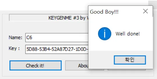 Forms::TApplication::MessageBox(*(Forms::TApplication **)off_45E9C0[0], "Well done!", "Good Boy!!!", 0x40u);