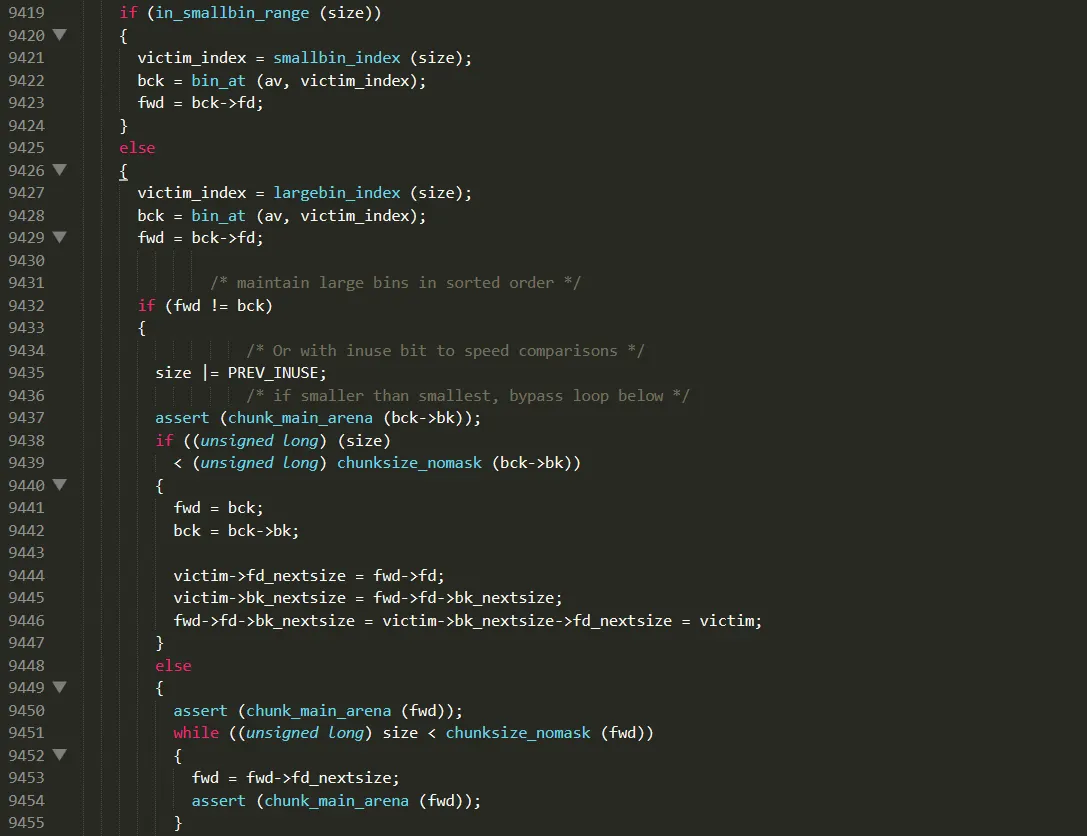 아래코드 맨 위에 else 부분은 small bin 관련 로직이 아닌 경우부터 시작되는 코드다