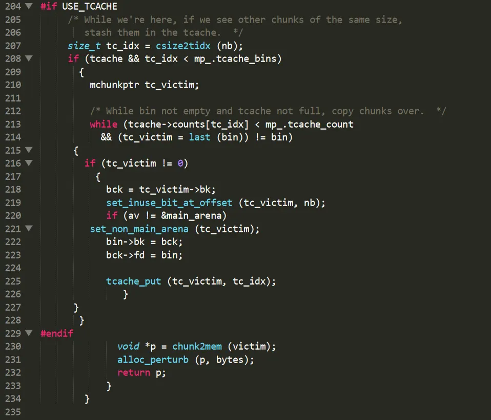 기존 glibc 2.23 처럼 fastbin or unsorted bin or small bin을 확인하고 재할당 가능한 청크가 있다면, 할당해준다. 그다음 현재 tcache_entry[tc_idx]에 자리가 비여있다면, tcache 에 넣을 수 있을 만큼 빈들에 있는 청크를 넣는다