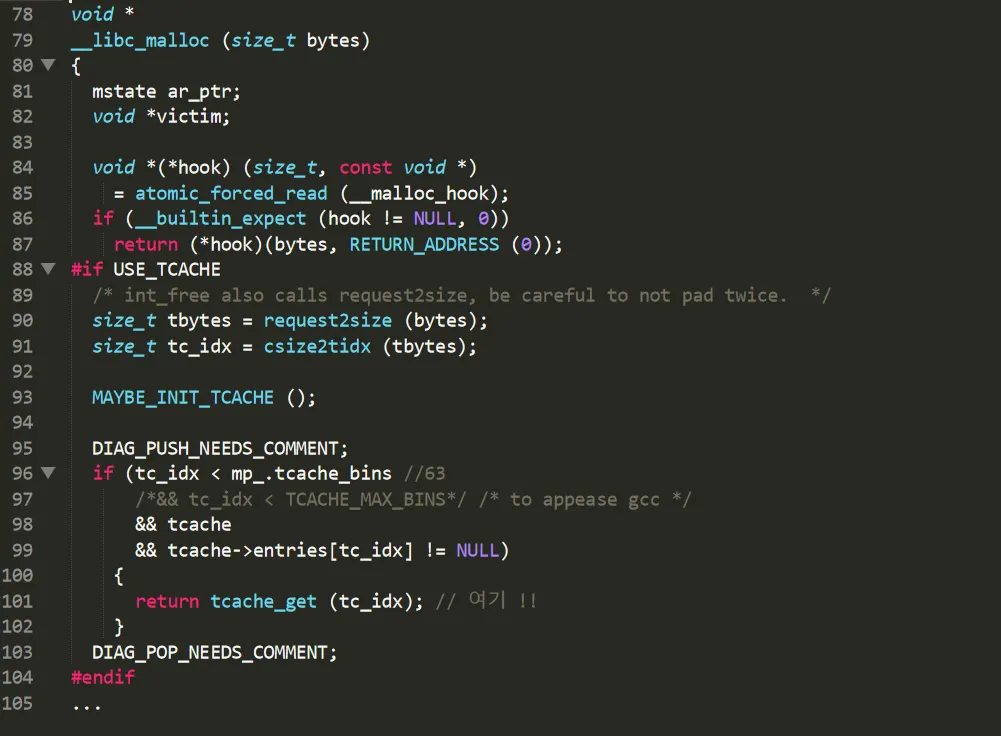 91 라인 > tbytes 변수에 저장된 청크 크기를 이용하여 tcache 인덱스 저장 (tc_idx)
